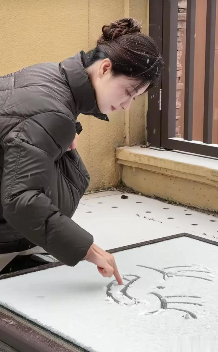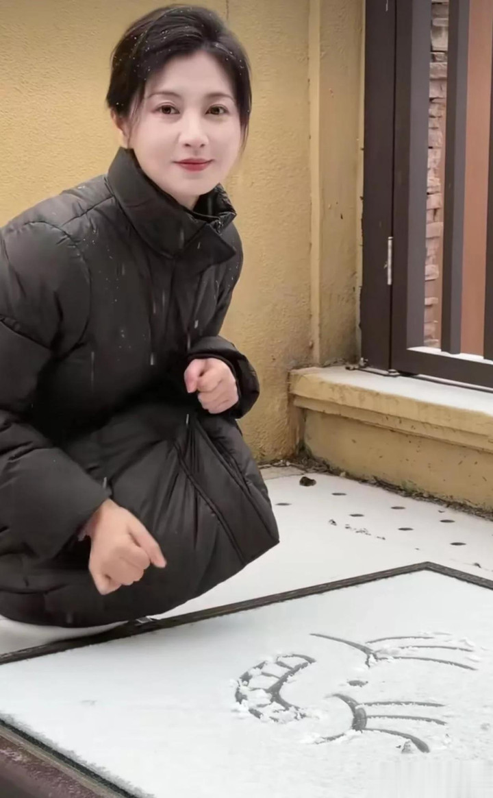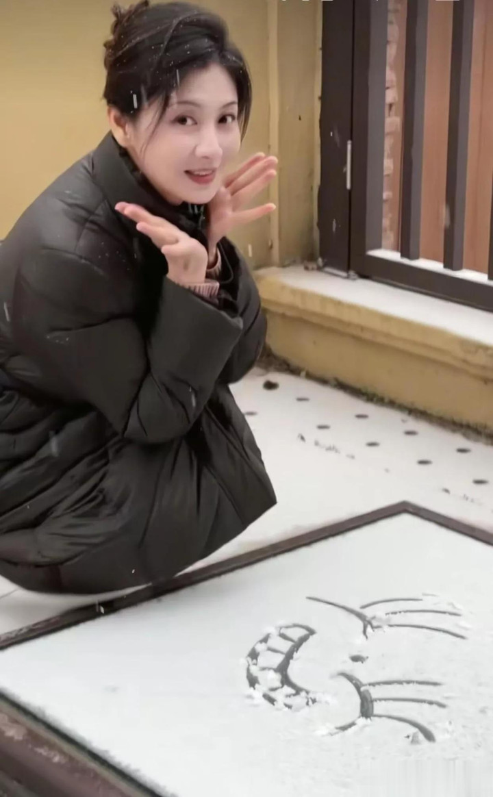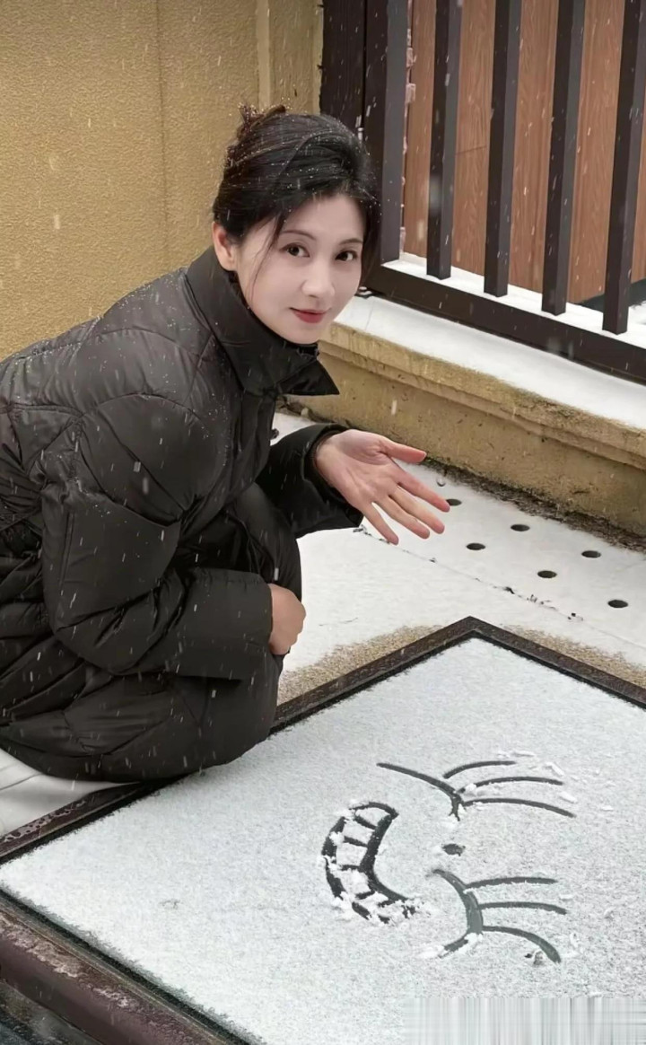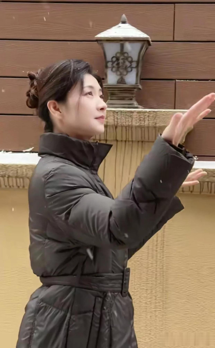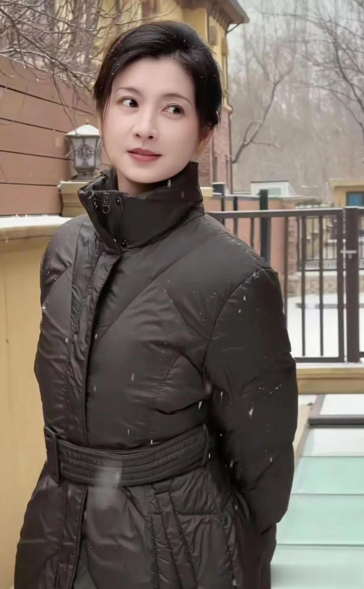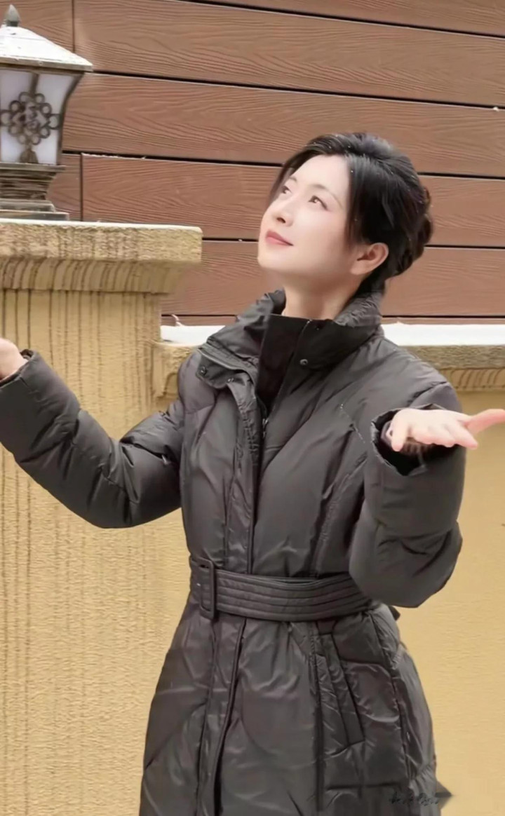 42岁斓曦雪景照, 身穿黑色立领羽绒服, 网友称该款已是10年旧款
